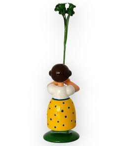 Im frühlingshaften gelben Kleid mit der weißen Bluse zaubert dieses Blumenmädchen Sonnenschein in jedes Zuhause, in der Hand hält es eine große, leuchtend blau-weisse Vergissmeinnicht.. Das freundliche Gesicht des kleinen Mädchen mit den rosa Wangen, den blauen Augen sowie dem roten Mund wird detailreich von Hand aufgemalt, die braunen Haare des Blumenkindes sind seitlich zu 2 Haarschnecken eingedreht.