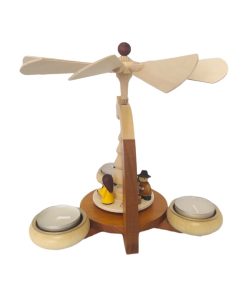 Die Achse um die ein Waldarbeiter, eine Pilzsammlerin sowie ein Jäger ihre Runden drehen wird von handelsüblichen Teelichtern betrieben, eine Sternschnuppe bildet den Bogen dieser hübschen Pyramide.