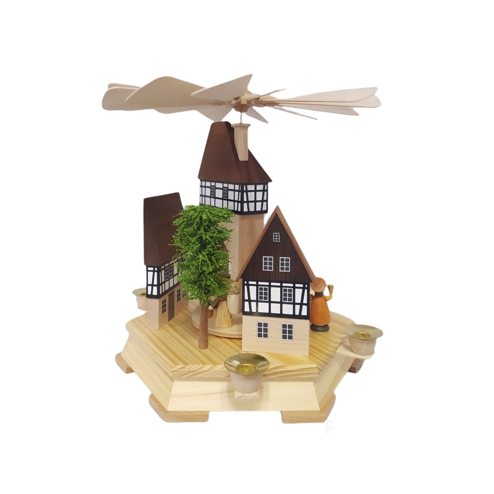 Emsiges Treiben auf dem Marktplatz der Altstadt, zwischen alten Fachwerkäusern und einem hohen Turmbogen drehen sich aufwendig und detailreiche Figuren. Ein Nachwächter mit Hellebarde und Laterne, ein Holzsammler mit Holz auf dem Rücken, ein Marktweib mit einem Korb voll Pilze sowie eine Frau mit Allerlei Waren auf dem Rücken lassen einem an der Pyramide nicht satt sehen. Am Rande des Treibens schwingt ein Ausrufer seine Glocke und verkündet Neues. Grüne Büsche und Bäume lassen diese Pyramide besonders authentisch wirken.