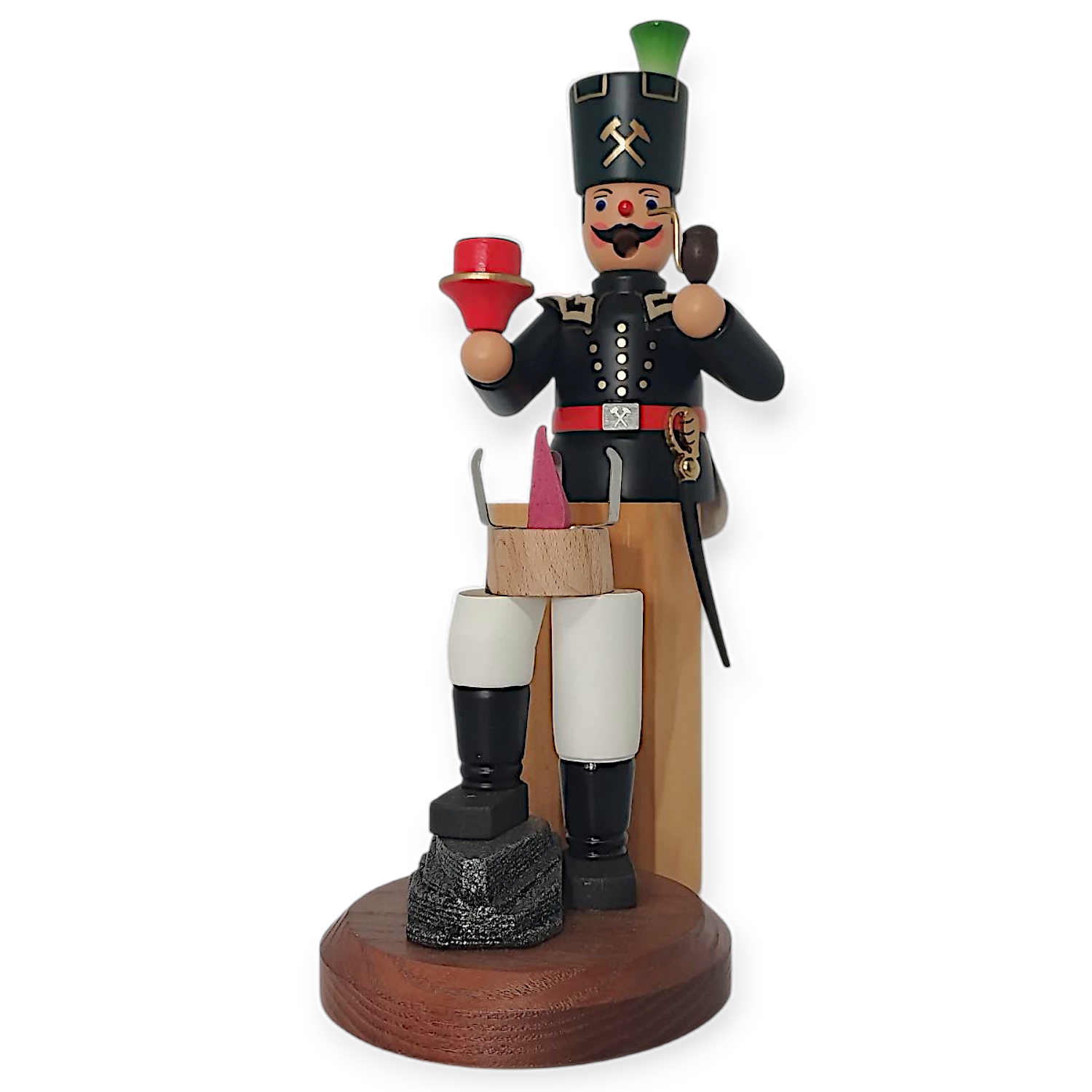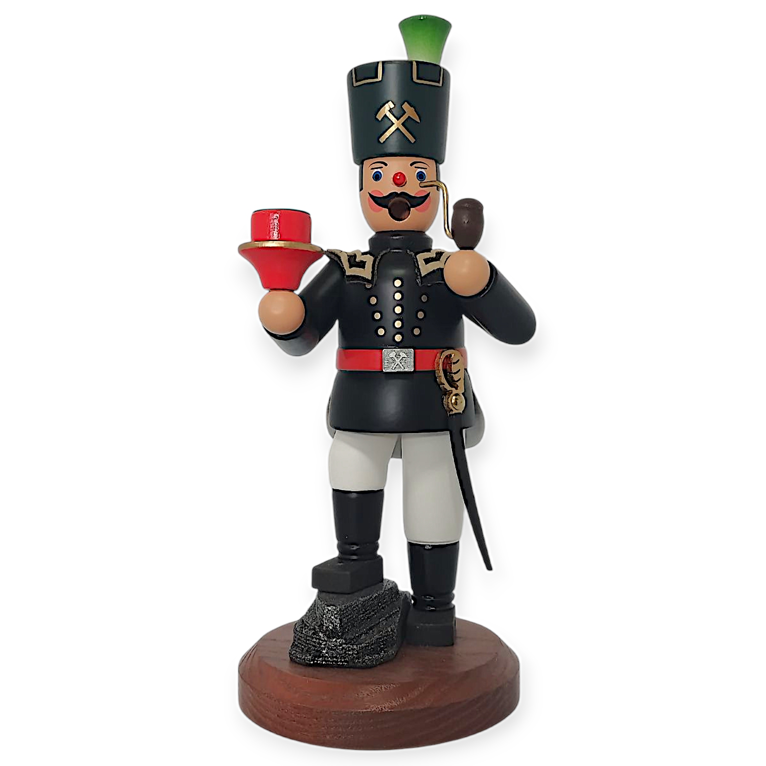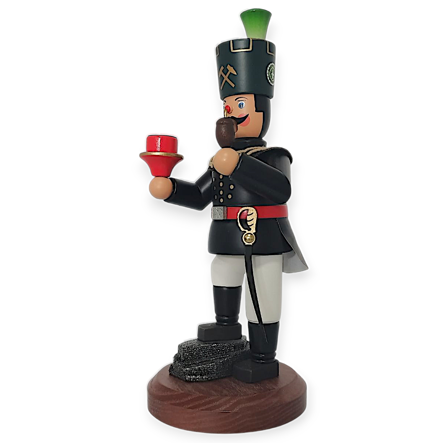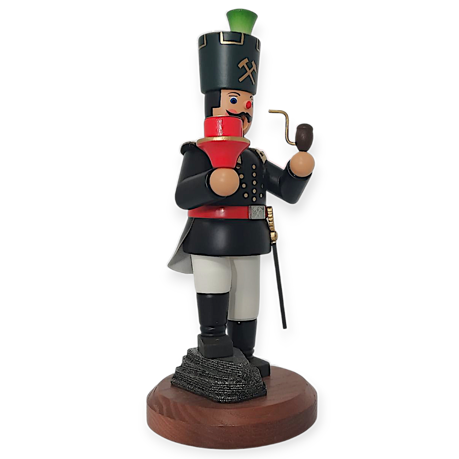 In seiner linken Hand hält er einen roten Kerzenhalter, der an das Licht der Bergleute erinnert. Die rechte Hand umfasst eine klassische Pfeife – typisch für Räuchermänner, aus der später der wohlige Rauch aufsteigt. Seine hohe schwarze Mütze trägt das gekreuzte Symbol von Schlägel und Eisen – ein Zeichen des Bergmannsstandes. Ein grüner Federbusch krönt die Mütze als farblicher Akzent.
