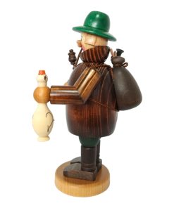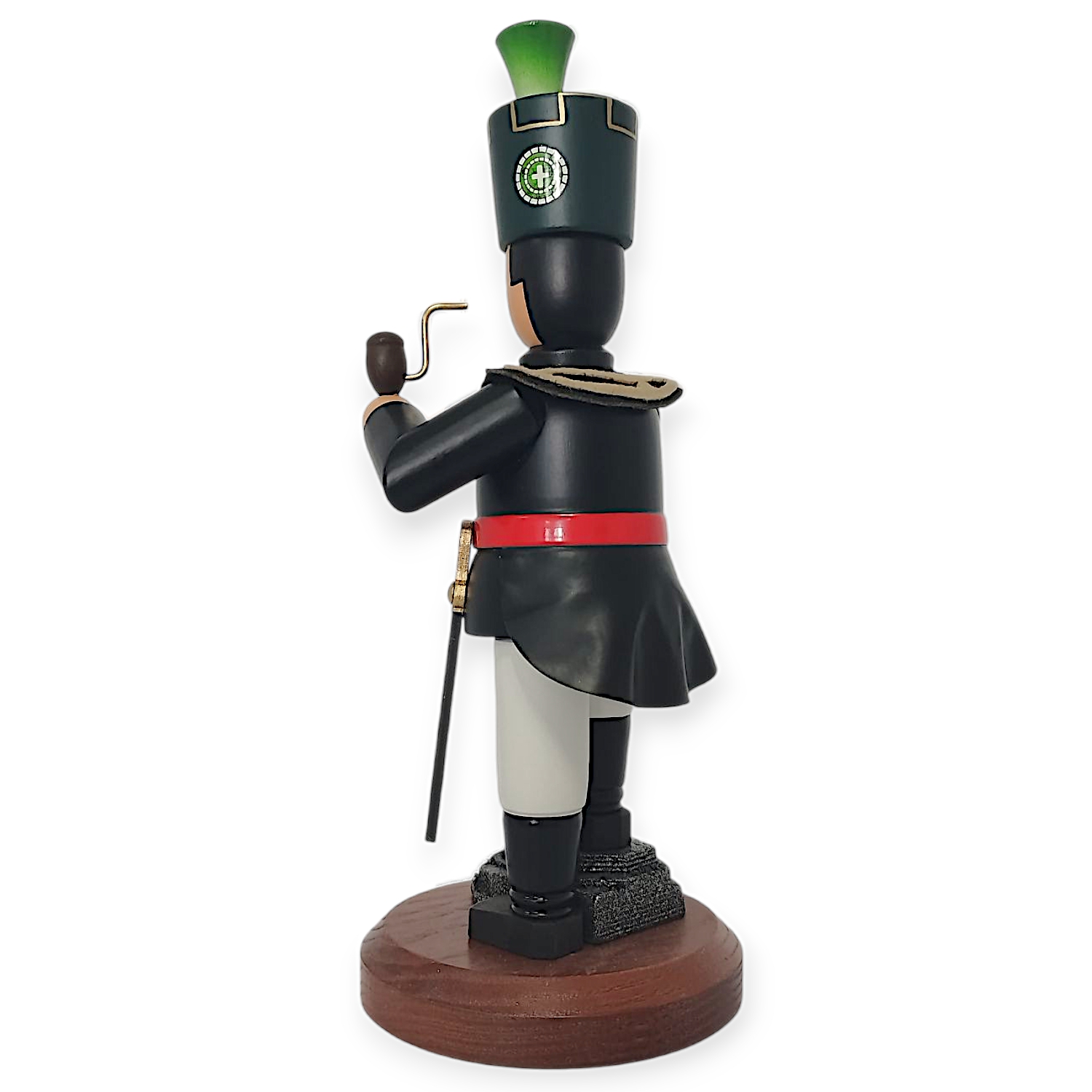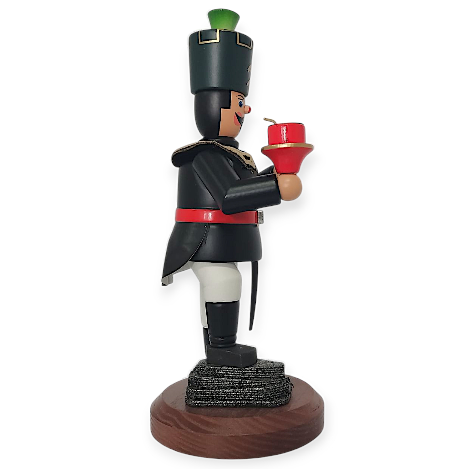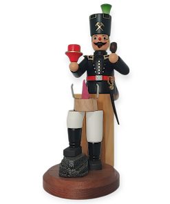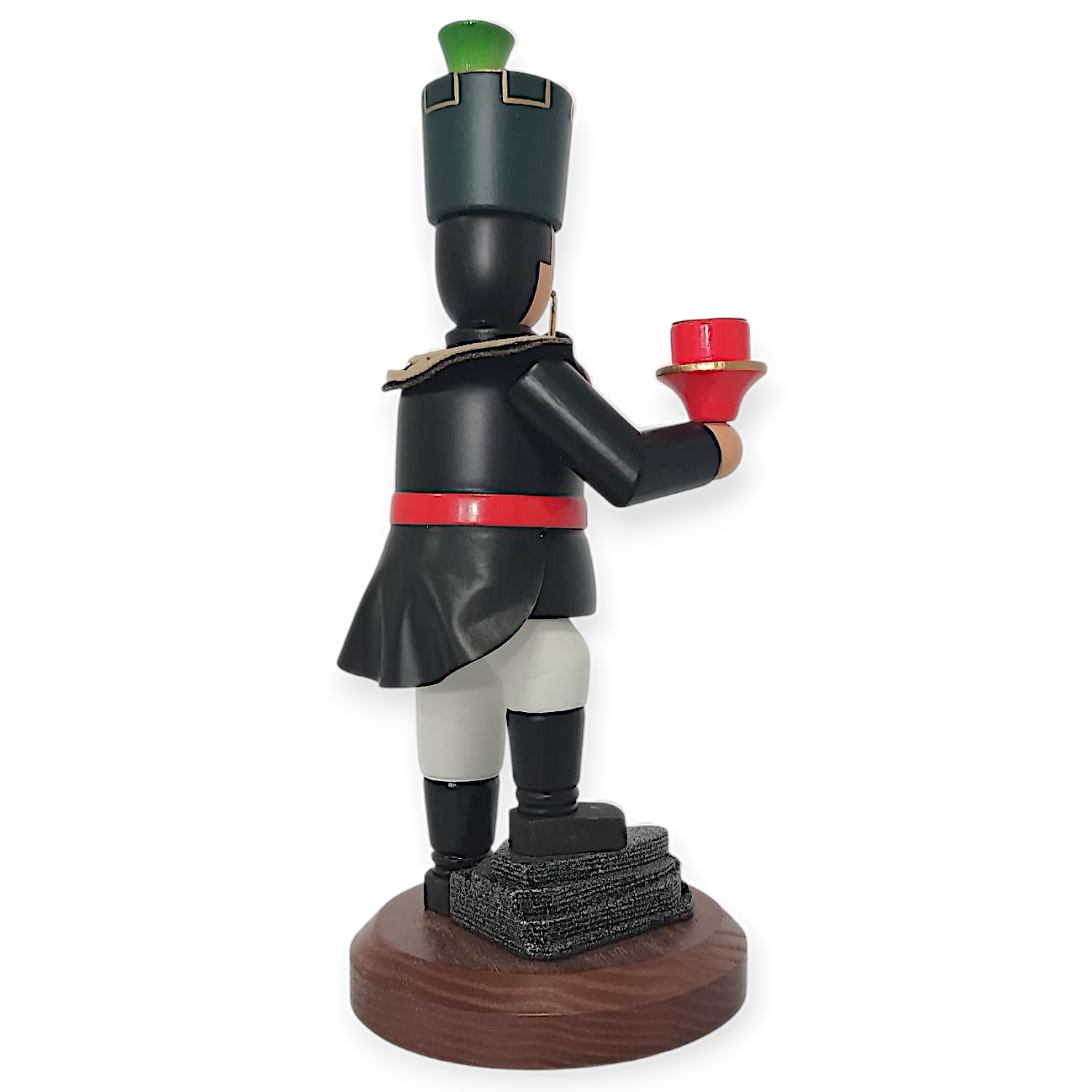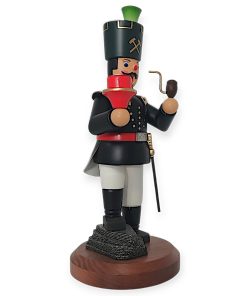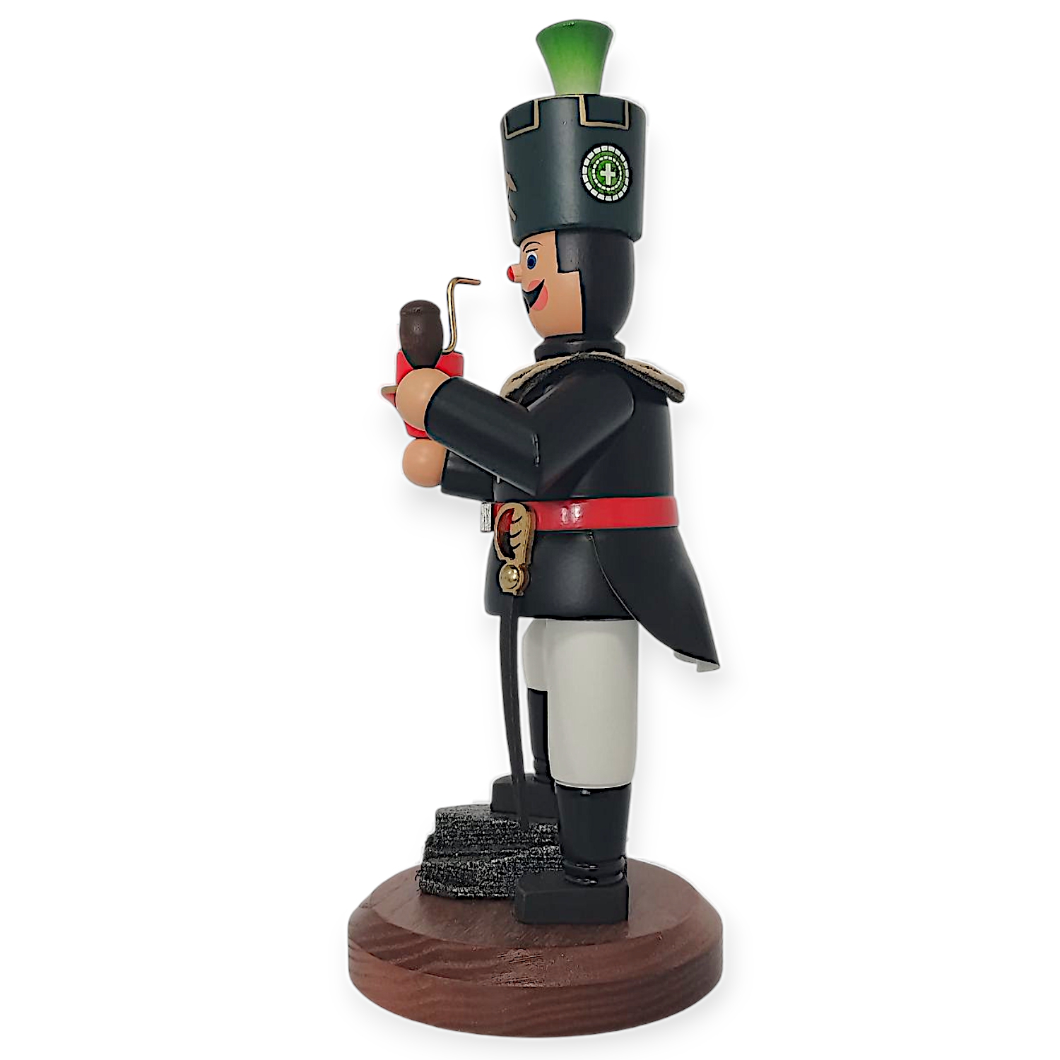 In seiner linken Hand hält er einen roten Kerzenhalter, der an das Licht der Bergleute erinnert. Die rechte Hand umfasst eine klassische Pfeife – typisch für Räuchermänner, aus der später der wohlige Rauch aufsteigt. Seine hohe schwarze Mütze trägt das gekreuzte Symbol von Schlägel und Eisen – ein Zeichen des Bergmannsstandes. Ein grüner Federbusch krönt die Mütze als farblicher Akzent.