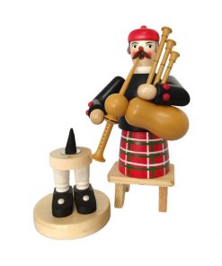 Ganz traditionell im rot-grünen Kilt sowie der passenden Mütze auf dem Kopf und schwarzer Jacke mit roten Knöpfen gekleidet steht dieser Räuchermann mit seinen schwarzen Schuhen fest auf dem natur-farbenen Podest. In Händen hält der freundliche Räuchermann mit den großen Augen, den rosa Wangen und dem dunklen Schnauzbart einen detailgetreuen Dudelsack.