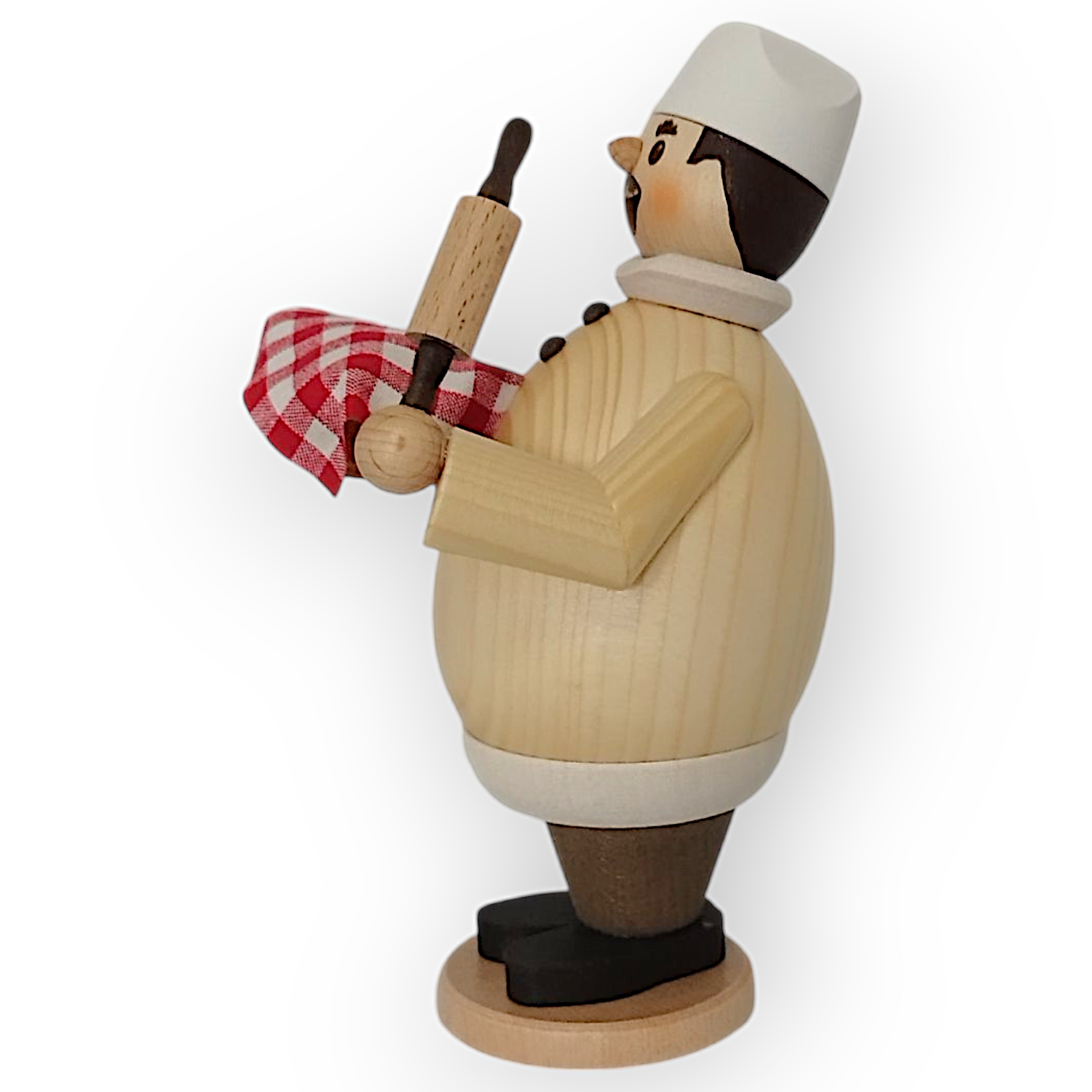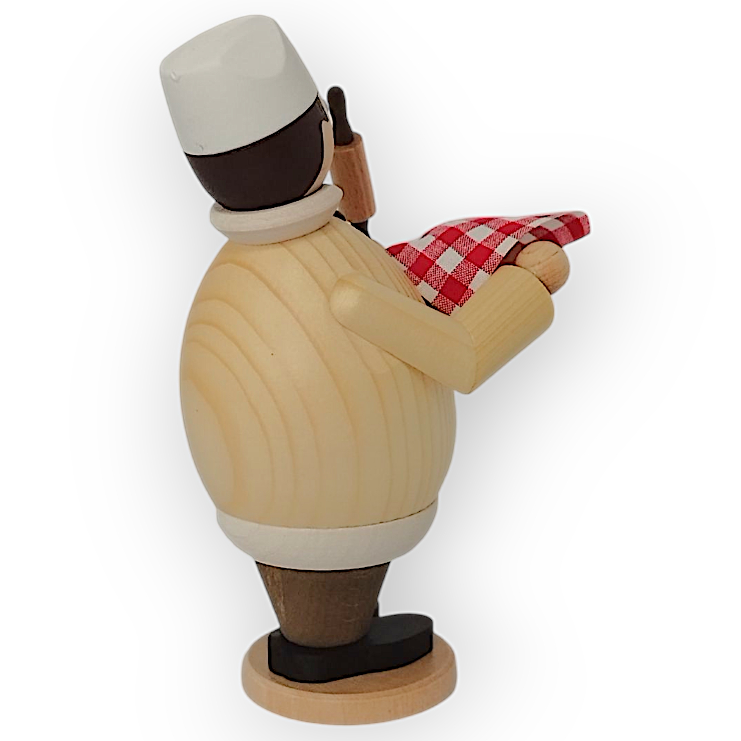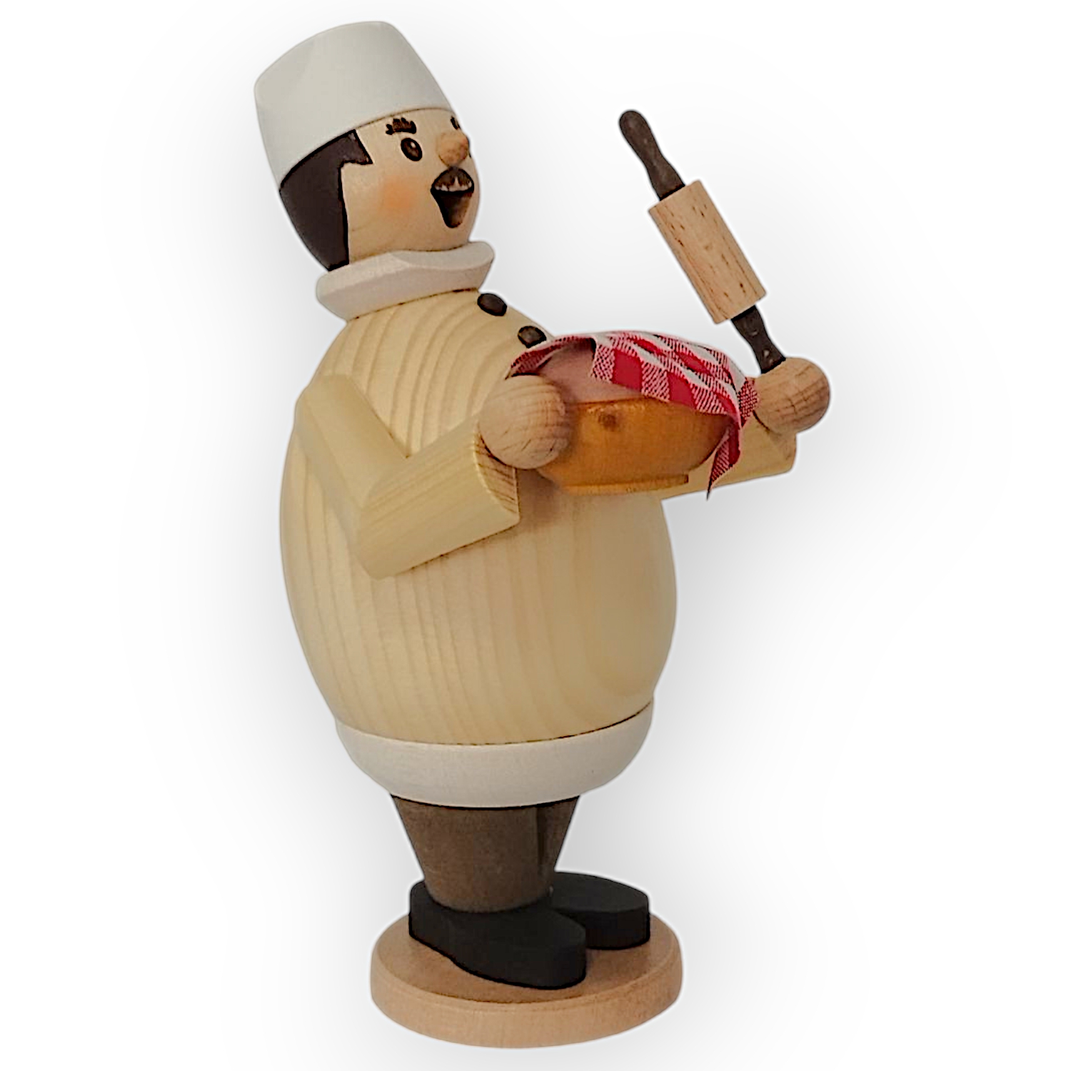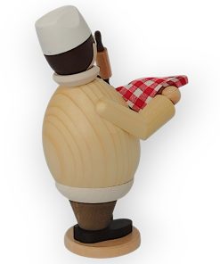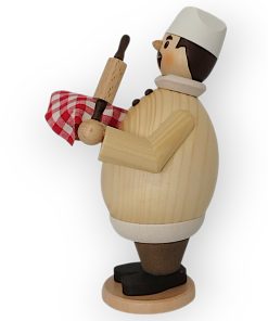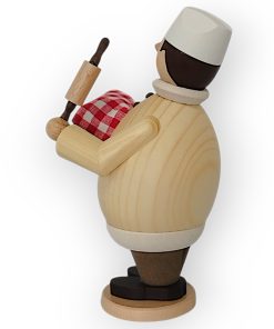 Der Räuchermann Max als Hobbybäcker, gefertigt von der Drechslerei Kuhnert, ist ein Beispiel traditioneller Handwerkskunst. Jedes Detail dieser Figur zeigt die hohe Kunstfertigkeit und Sorgfalt, die in ihrer Herstellung stecken. Max hat eine rundliche, kompakte Form, die durch die naturbelassene Oberfläche seines Oberteils besonders gut zur Geltung kommt. Die Maserung des Holzes ist klar erkennbar und verleiht ihm eine rustikale, aber zugleich elegante Ausstrahlung. Sein runder Bauch wird von schwarzen Knöpfen geschmückt, die ihm eine sympathische und leicht humorvolle Note verleihen.