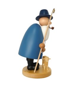 In blauem Gewand gekleidet steht der Räuchermann Schäfer in seinen schwarzen Stiefeln fest auf einem kleinen Podest vorm ihm eins seiner Schafe, in der Hand hält er ein Seil sowie seinen Schäferstock.